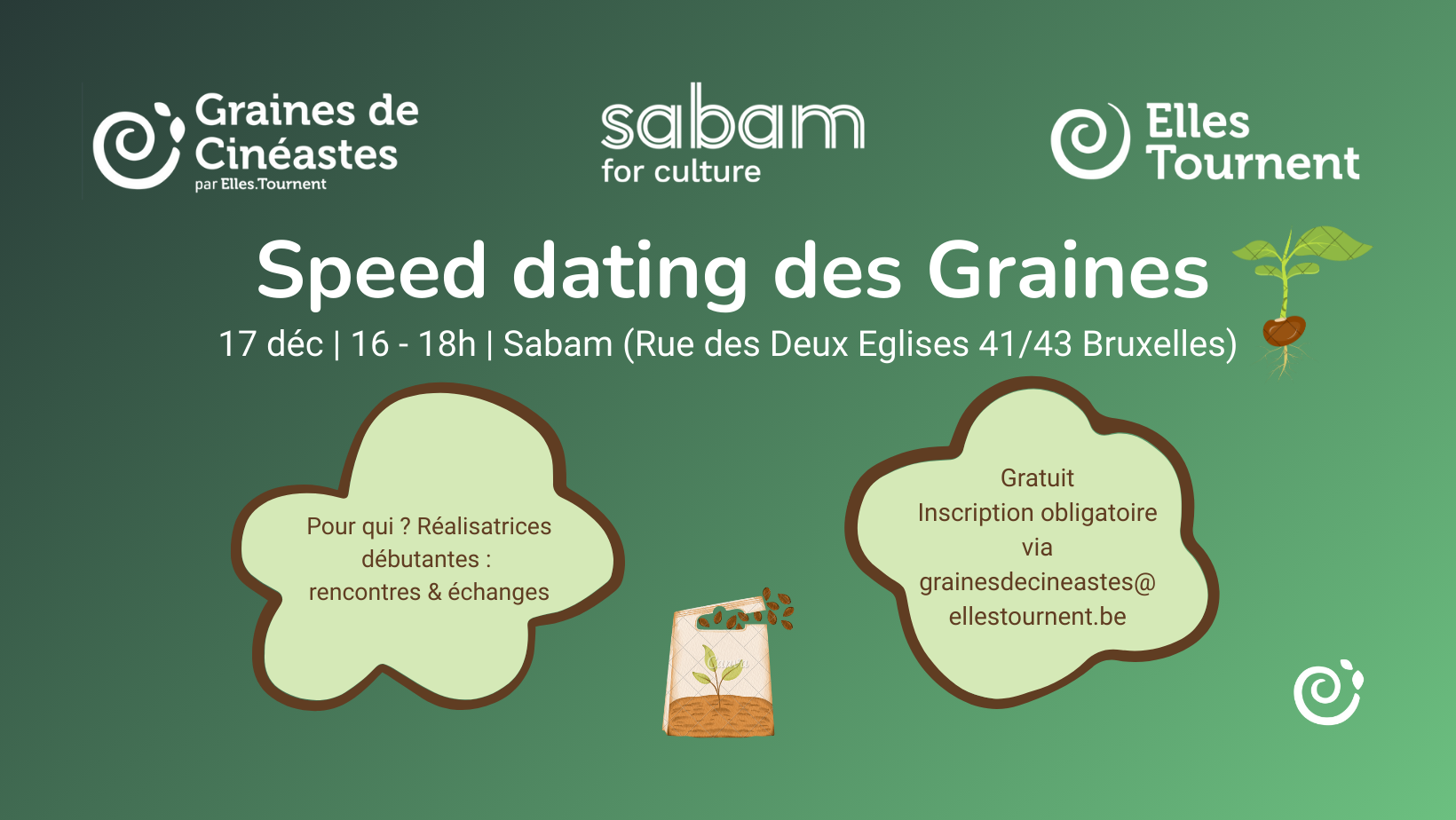 🎬 Speed Dating des Graines – 17 décembre, de 16h à 18h à la Sabam 🌱 Le Speed Dating des Graines revient ! Vous souhaitez rencontrer d’autres femmes* du milieu audiovisuel ou cinématographique ? Échanger autour de vos expériences, élargir votre réseau ou trouver de futur ·es partenaires de travail ? Cet événement est fait pour vous. Nous avons hâte de vous y retrouver ! ☺️ 💶 Tarif : Gratuit 📝 Inscription : obligatoire via grainesdecineastes@ellestournent.be. 👤 Public : personnes s’identifiant en tant que femme ou personne non-binaire, actives dans le secteur audiovisuel/cinématographique. ⚠️ Les places sont limitées et partent très vite, ne tardez pas à vous inscrire !