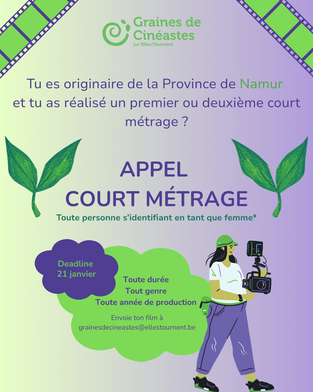 Tu es une réalisatrice, originaire de la Province de Namur et tu as réalisé un premier ou deuxième court métrage ? Postule dès maintenant en envoyant ton court métrage à grainesdecineastes@ellestournent.be. Conditions : Toute durée ; Tout genre ; Toute année de production. Deadline : 21 janvier A vos courts !