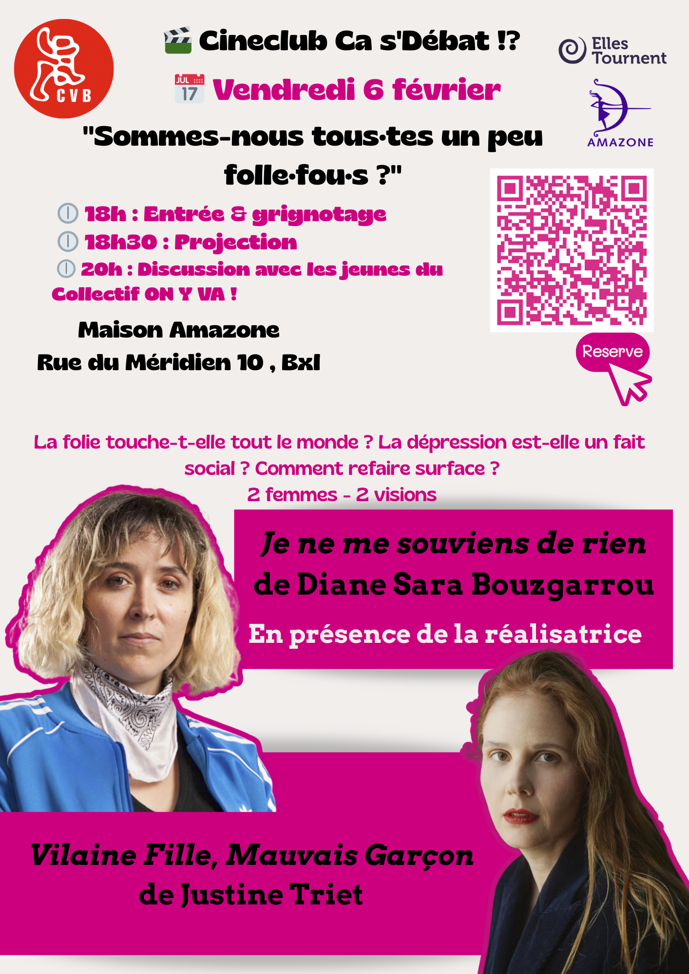 📅 06/02 – 18h - 📍vzw Amazone asbl Titre de la séance : Sommes-nous tou ·te·s un peu fou ·folles ? Pour cette nouvelle séance du Cinéclub Ça s’débat! ?, nous vous invitons à explorer la folie intime, sociale, ordinaire, à travers deux regards féminins puissants, suivis d’un échange collectif.