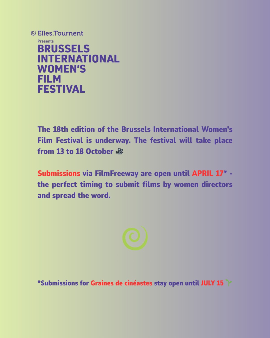 *Submissions for Graines de cinéastes (first or second short film, by Belgian women or living in Belgium) stay open until July 15